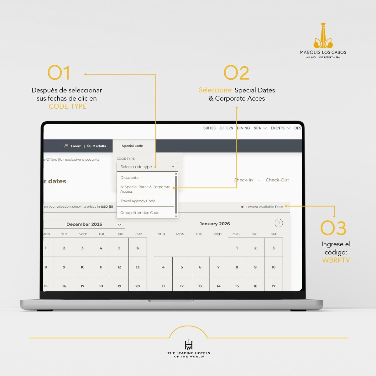 Esta oferta es válida exclusivamente para huéspedes recurrentes de Marquis Los Cabos. Se requiere haber hospedado en el resort al menos una vez antes de reservar esta promoción. La oferta aplica únicamente para nuevas reservaciones y no puede combinarse con otras promociones, tarifas con descuento o paquetes previamente contratados. El descuento se aplica sobre la mejor tarifa pública disponible al momento de la reserva. La promoción está sujeta a disponibilidad, fechas restringidas y otras condiciones adicionales. Impuestos y cargos por servicio están incluidos. Esta promoción puede ser modificada o cancelada sin previo aviso.